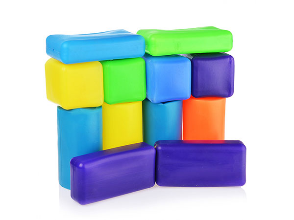 Набор пластмассовых деталей разной формы, размера и цвета.